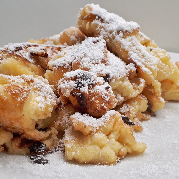 Mehl, Zucker, Rosinen, Salz und die Eidotter mit der Milch zu einem glatten, dickflüssigen Teig verrühren. Das Eiweiss zu steifem Schnee schlagen und vorsichtig unter den Teig heben. Butter in einer Pfanne schmelzen und den Teig eingießen. Wenn die Unterseite leicht braun wird, wenden. Mit zwei Gabeln in grössere Stücke zerreissen, mit etwas Kristallzucker bestreuen und im vorgeheizten Backrohr ca. 10-15 min fertigbacken.