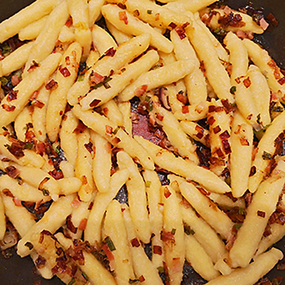 Inzwischen die Zwiebel und den Schinkenspeck fein hacken und in einer Pfanne ohne Öl aufrösten. Fertig gekochte Nudeln mit Sieb abschöpfen und zu der gerösteten Zwiebel-Schinkenspeck-Mischung geben. Leicht schwenken.